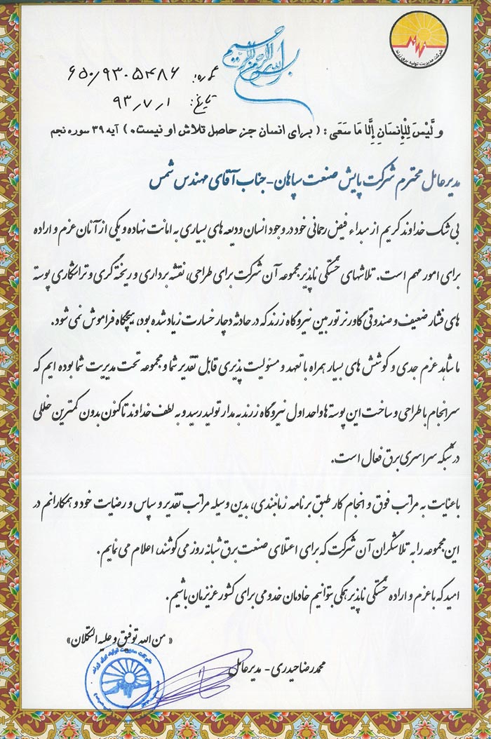 تقدیرنامه شرکت مدیریت تولید برق زرند