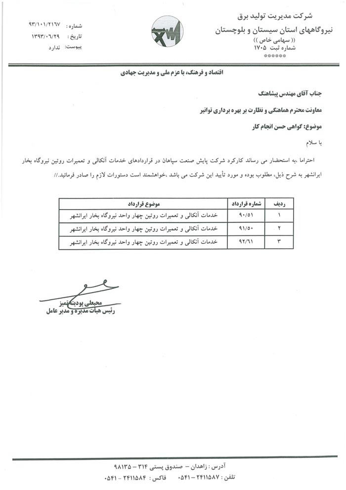 گواهی حسن انجام کار از شرکت مدیریت تولید برق نیروگاههای استان سیستان و بلوچستان