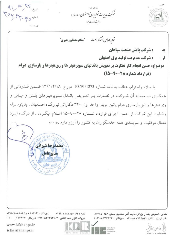 گواهینامه حسن انجام کار از شرکت مدیریت تولید برق اصفهان