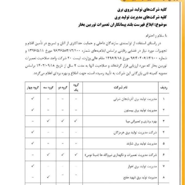 گواهی تائید صلاحیت پیمانکار تعمیرات توربین بخار