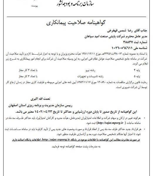 گواهینامه تائید صلاحیت پیمانکاری پایه 4 و پایه 5