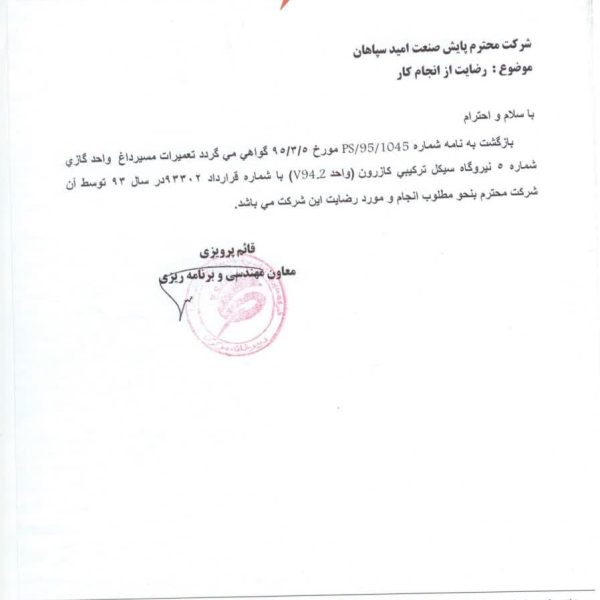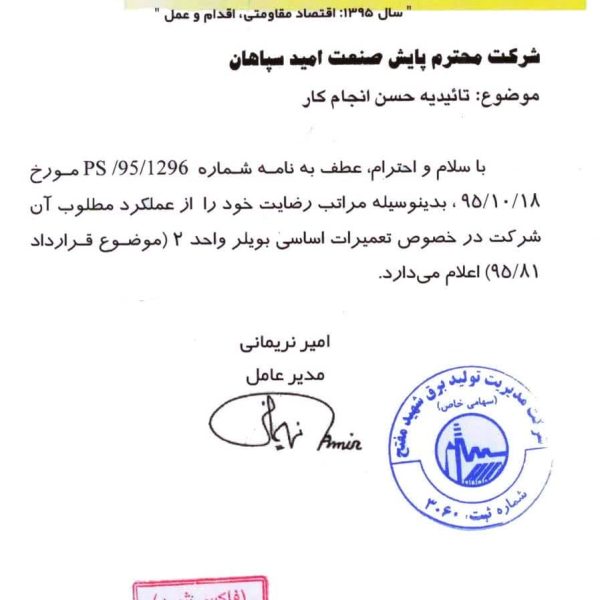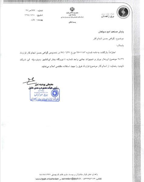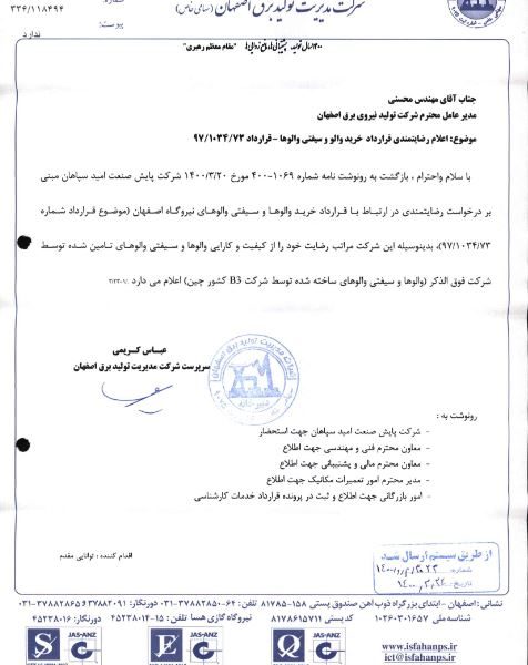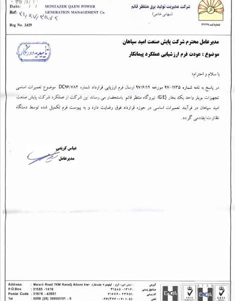 گواهینامه های دریافتی از نیروگاه منتظرقائم کرج